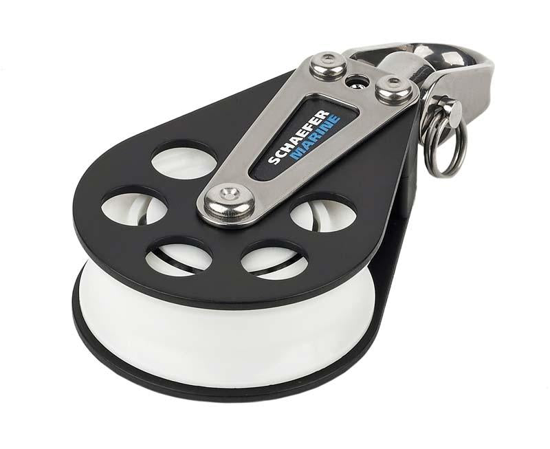 Single block with aluminum cheeks and ball bearing sheave. Delrin(tm) ball bearing sheave provides a low-friction yet high safe working load block. Swivel head may be locked in place to eliminate twists.