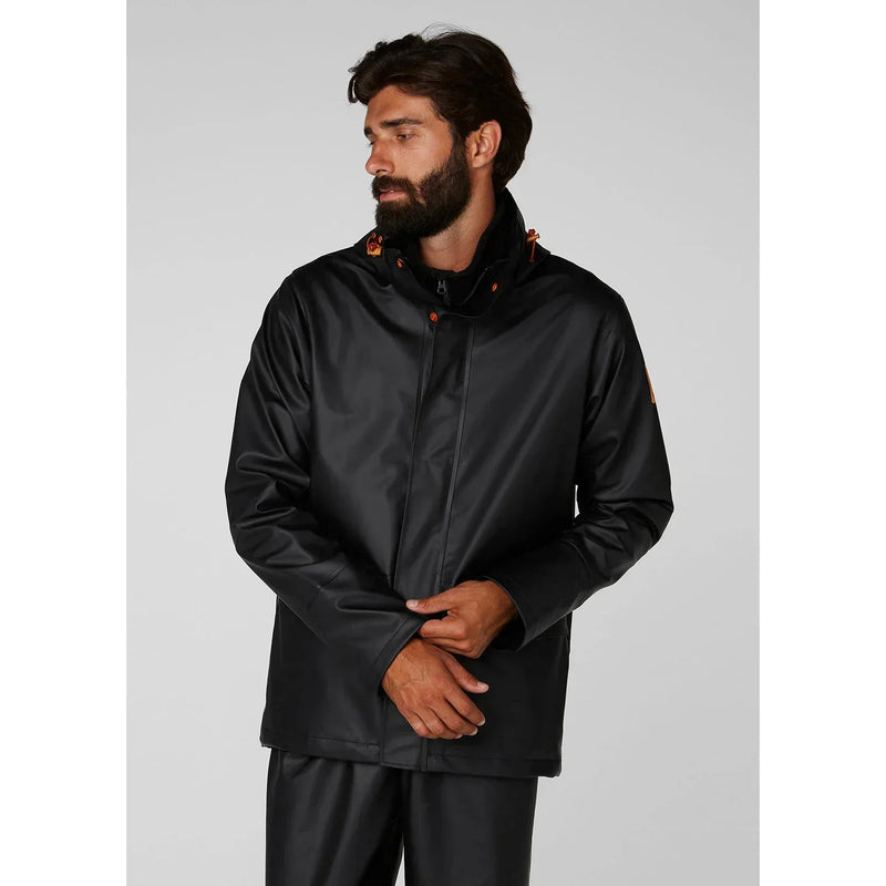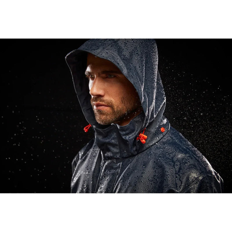 The Gale Rain Jacket sets a new standard in rain gear built for workers, delivering waterproof and durable protection with a stretch fabric to allow for easy movement. Packed with features to make your day easier on the job, the Gale features an adjustable, packable hood along with a drop back for extended coverage, the neoprene cuffs prevent water from traveling down the arm as well. The zippered front features a double storm flap to keep water out and also has a hidden zippered chest pocket with a headphone hole. The phthalate free fabrics ensures low environmental impact while at the same time keeping you dry no matter the weather.
